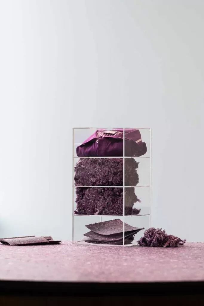 For this project, we transformed 2500 kg of purple workwear into our Rezign® veneer. All uniforms were shredded into small pieces, which were then carded into felt. The felt was eventually pressed with a biodegradable binder into a hard veneer. And this purple veneer lends itself perfectly to new products, such as table tops, desks, and cabinets. A great solution for overstock or old uniforms, which are prevented to end up on the immense mountain of landfill.